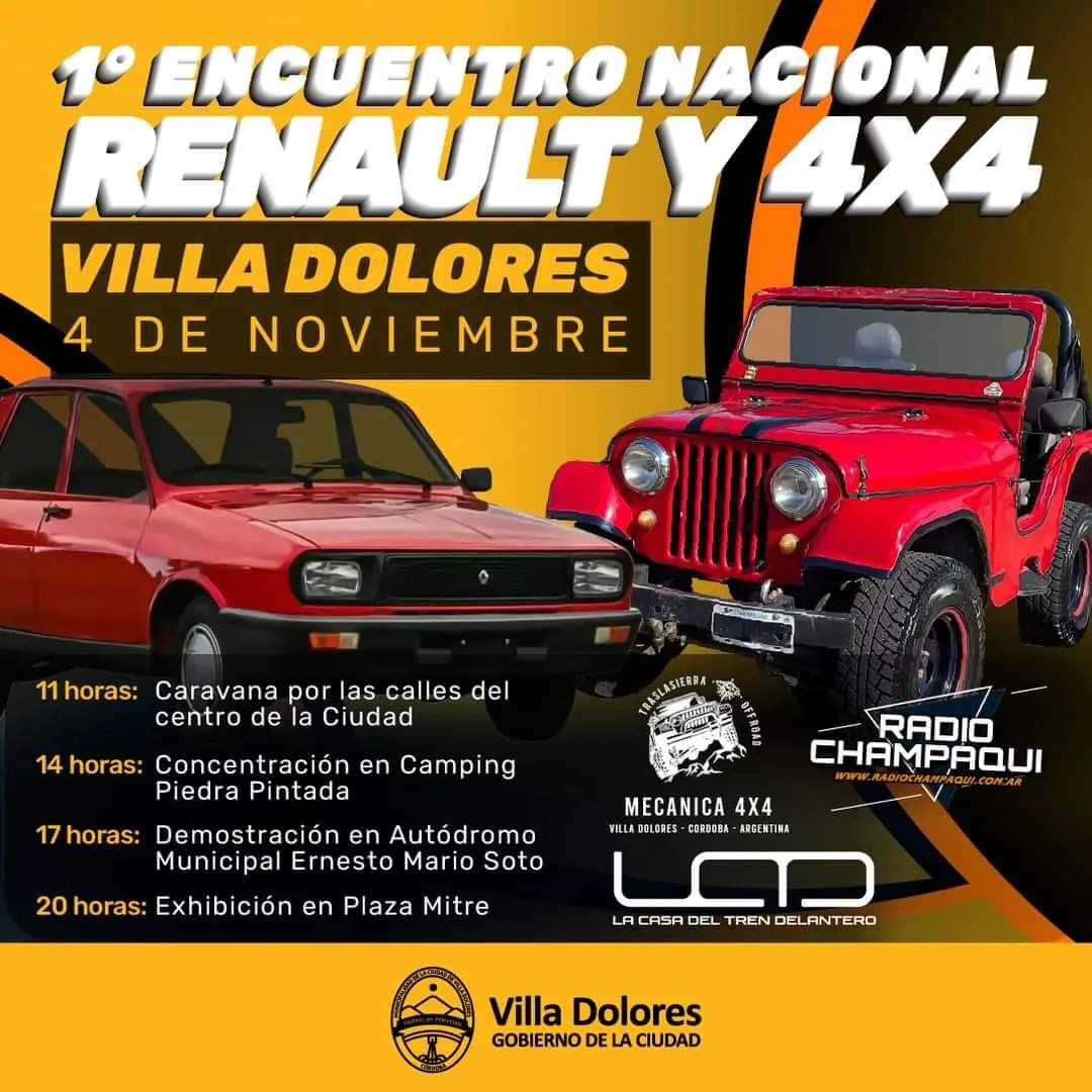 Con el auspicio del Gobierno de la ciudad, el próximo sábado 4 de noviembre Villa Dolores será epicentro del Primer Encuentro Nacional de Reanult y Jeep 4X4. El evento prevee una Caravana por las calles del centro de la Ciudad a las 11 horas para luego a las 14, concentrar en el Camping de la Piedra Pintada. Así mismo el gran atractivo será la demostración de los vehículos en el Autódromo Municipal a las 17 culminando con una gran exhibición en Plaza Mitre a partir de las 20 horas.