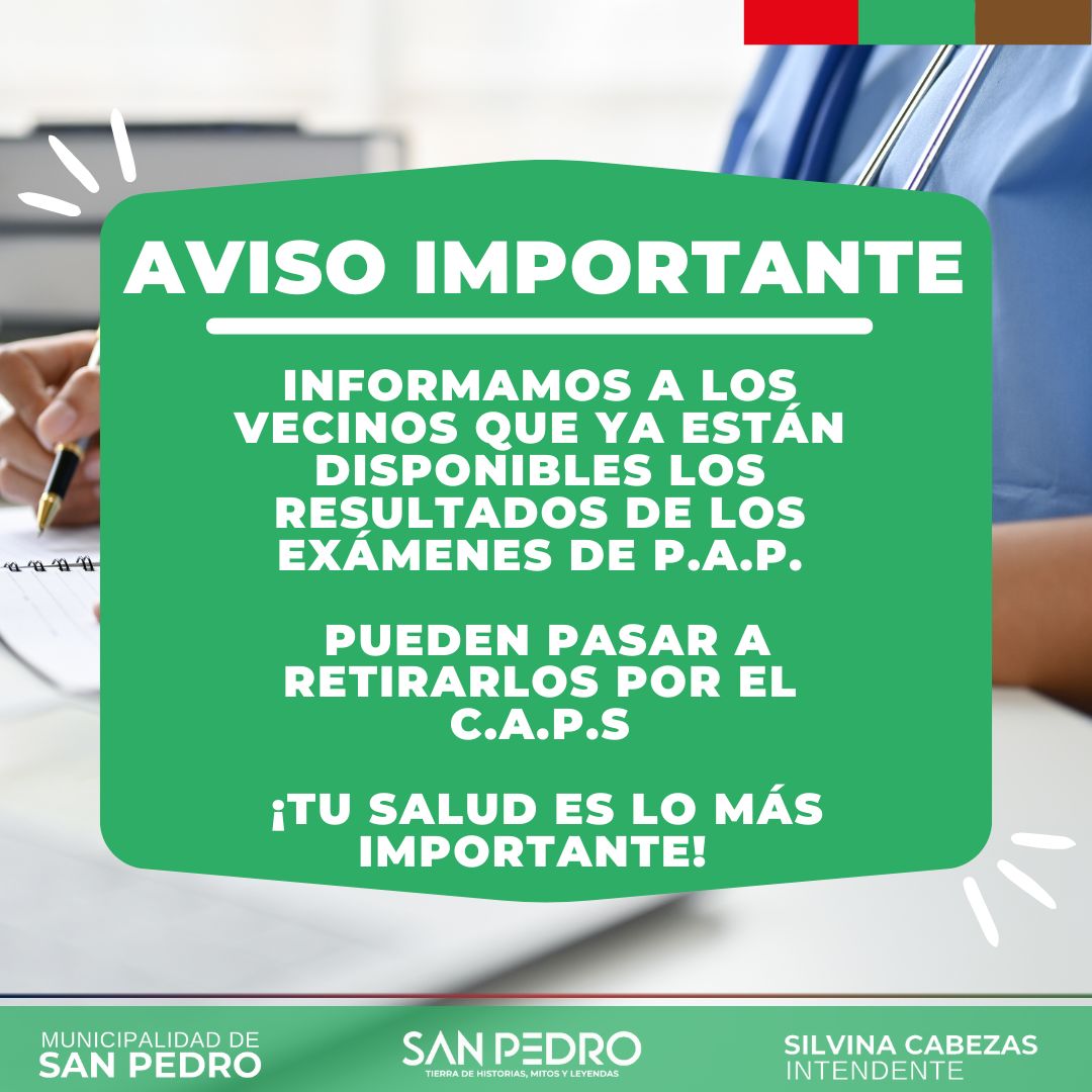 📢 Aviso Importante desde el Área de Desarrollo Social📢 Informamos a los vecinos,que ya están disponibles los resultados de los exámenes de PAP. Pueden pasar a retirarlos por el CAPS. ¡Tu salud es lo más importante! Municipalidad de San Pedro Tierra de historias mitos y leyendas Silvina Cabezas Municipalidad de San PedroTierra de historias mitos …