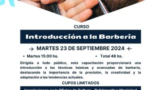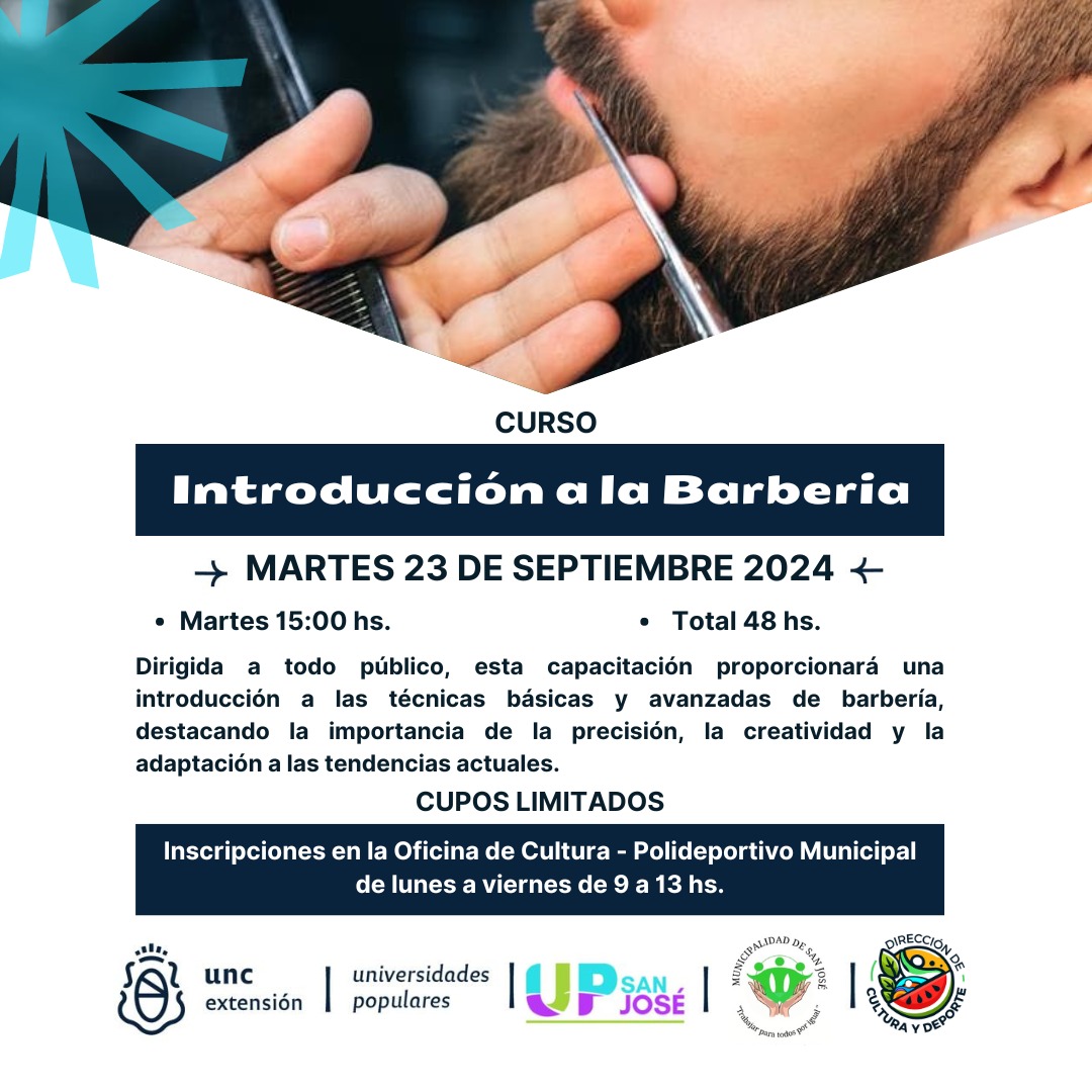 CURSO INTRODUCCIÓN A LA BARBERÍACupos limitados 🔹️Comienza Martes 23 de Septiembre🔹️15:00hs🔹️Mayor a 16 añosDirigido a todos aquellos que deseen capacitarse en técnicas básicas y avanzadas de barberia, destacando la importancia de la precisión, la creatividad y la adaptación a las tendencias actuales. 🔹️Inscripciones en Oficina de Cultura🔹️Av. Héroes de Malvinas s/n🔹️Lunes a Viernes de 07 …