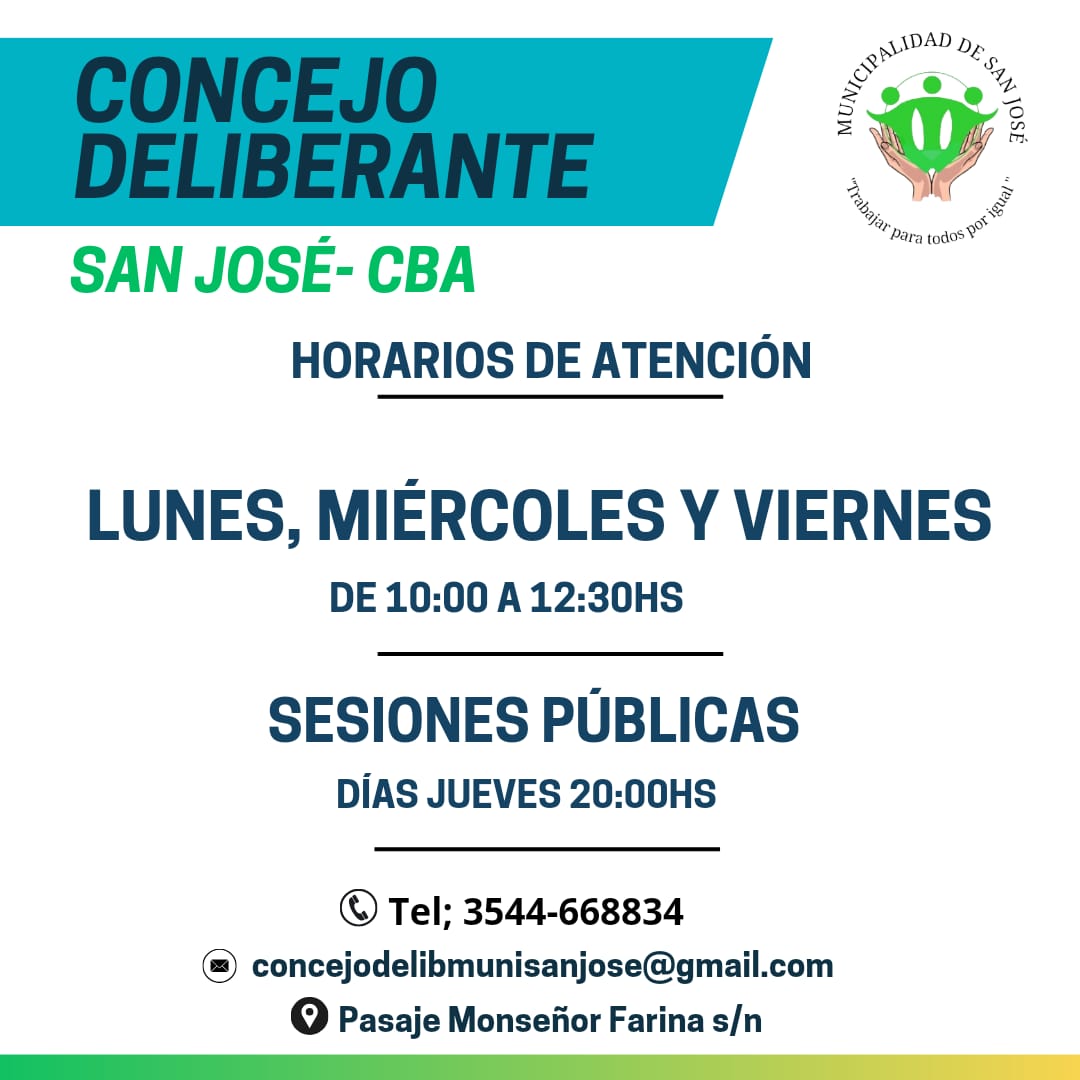 CONCEJO DELIBERANTE Horarios de atención🔹️Lunes, Miércoles y Viernes, de 10:00 a 12:30hs🔹️Sesiones públicas, los días Jueves a las 20:00hs🔹️Tel: 3544-668834🔹️Pasaje Monseñor Farina s/n Municipalidad de San JoséIntendente Américo Gómez«Trabajar para todos por igual»