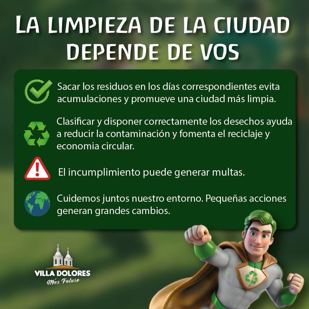LA LIMPIEZA DE LA CIUDAD ES RESPONSABILIDAD DE TODOS Como vecino, es fundamental que respetes los días y horarios de recolección para contribuir a hacer más eficiente el cuidado del medio ambiente. Juntos podemos generar un cambio real por Villa Dolores. . VILLA DOLORESMás futuro. .