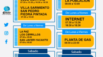 💡¡RECORDAMOS NUEVOS HORARIOS DE ATENCIÓN AL PÚBLICO⌛ A partir del 1 de abril! 📌 Sede Central: 07:30 a 13:30 y 16:30 a 18:30📌 Villa Sarmiento – San Pedro – Piedra Pintada: 07:30 a 15:30📌 La Población: 09:00 a 13:00📌 Planta de Gas: 06:00 a 22:00 (Lun a Sáb)📌 La Paz – Los Cerrillos: 07:30 a …
