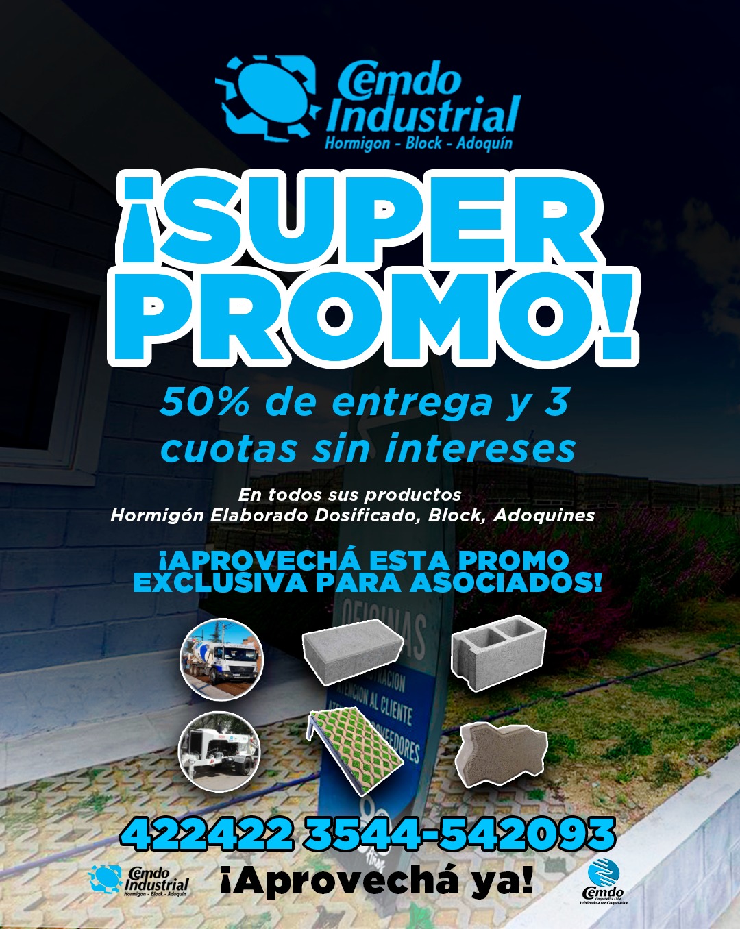 🚧👷 ¡ATENCIÓN ASOCIADOS!En Cemdo Industrial tenemos la PROMO que tu obra necesita: 🧱 Hormigón, block, adoquines, Bomba Hormigonera 💵 Pagás el 50% al entregar🗓️ ¡Y el resto en 3 CUOTAS SIN INTERÉS! 📍 ¡No la dejes pasar! 📲 Consultá al 3544 422422// 3544 522093