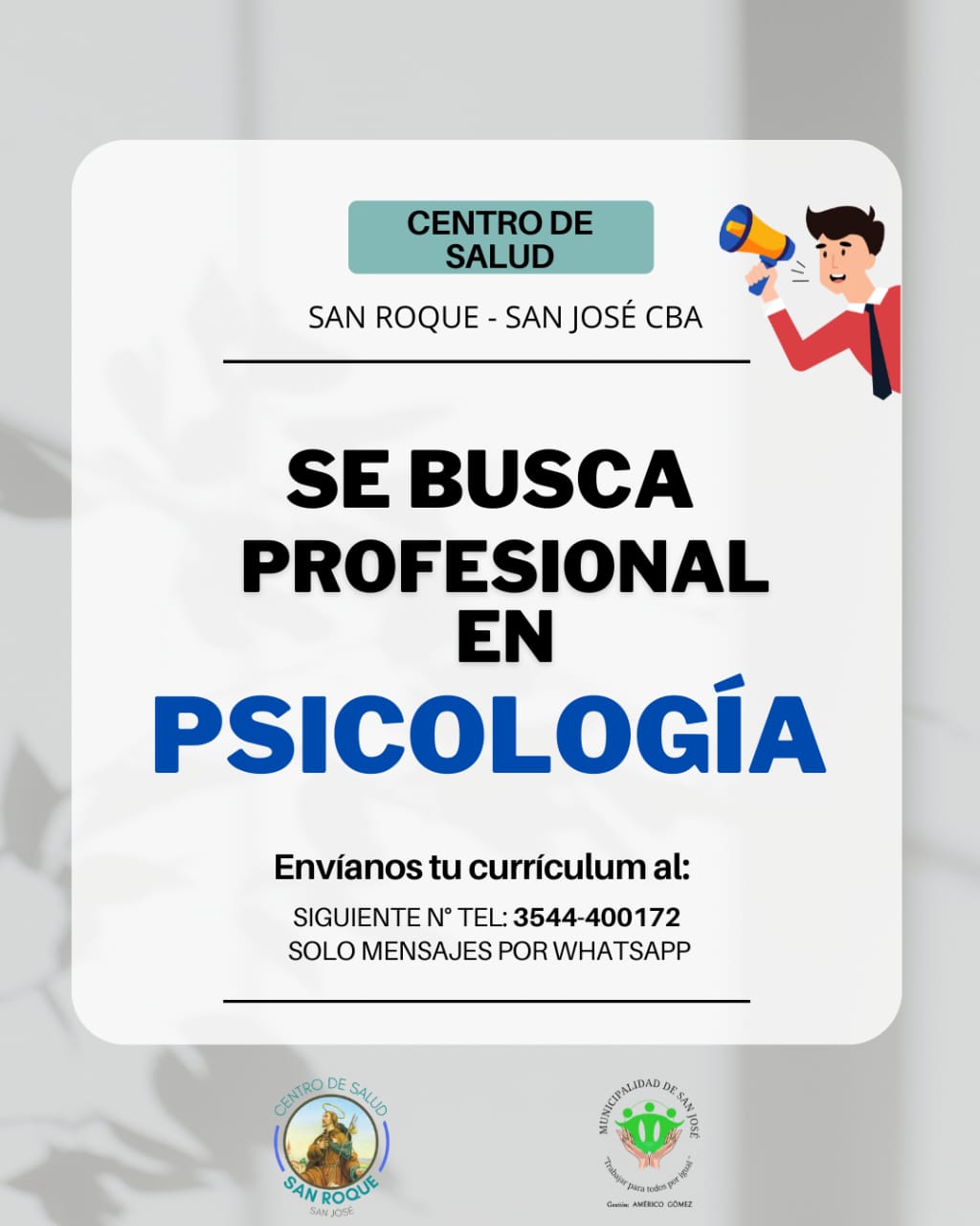 Centro de Salud «San Roque» de San José Busca profesional en Psicología, podes enviar el curriculum al: 3544-400172 (solo mensajes por WhatsApp)Municipalidad de San José Intendente Américo Gómez «Trabajar para todos por igual»