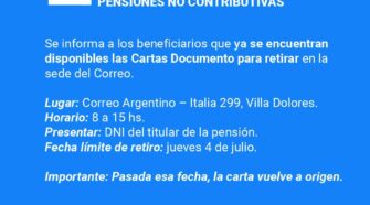 📢 ATENCIÓN VECINOS DE SAN JAVIER Y YACANTO Retiro de Cartas Documento – Pensiones No Contributivas Se informa a los beneficiarios que ya se encuentran disponibles las Cartas Documento para retirar en la sede del Correo. 📍 Lugar: Correo Argentino – Italia 299, Villa Dolores🕗 Horario: de 8 a 15 hs🪪 Presentar DNI del titular …
