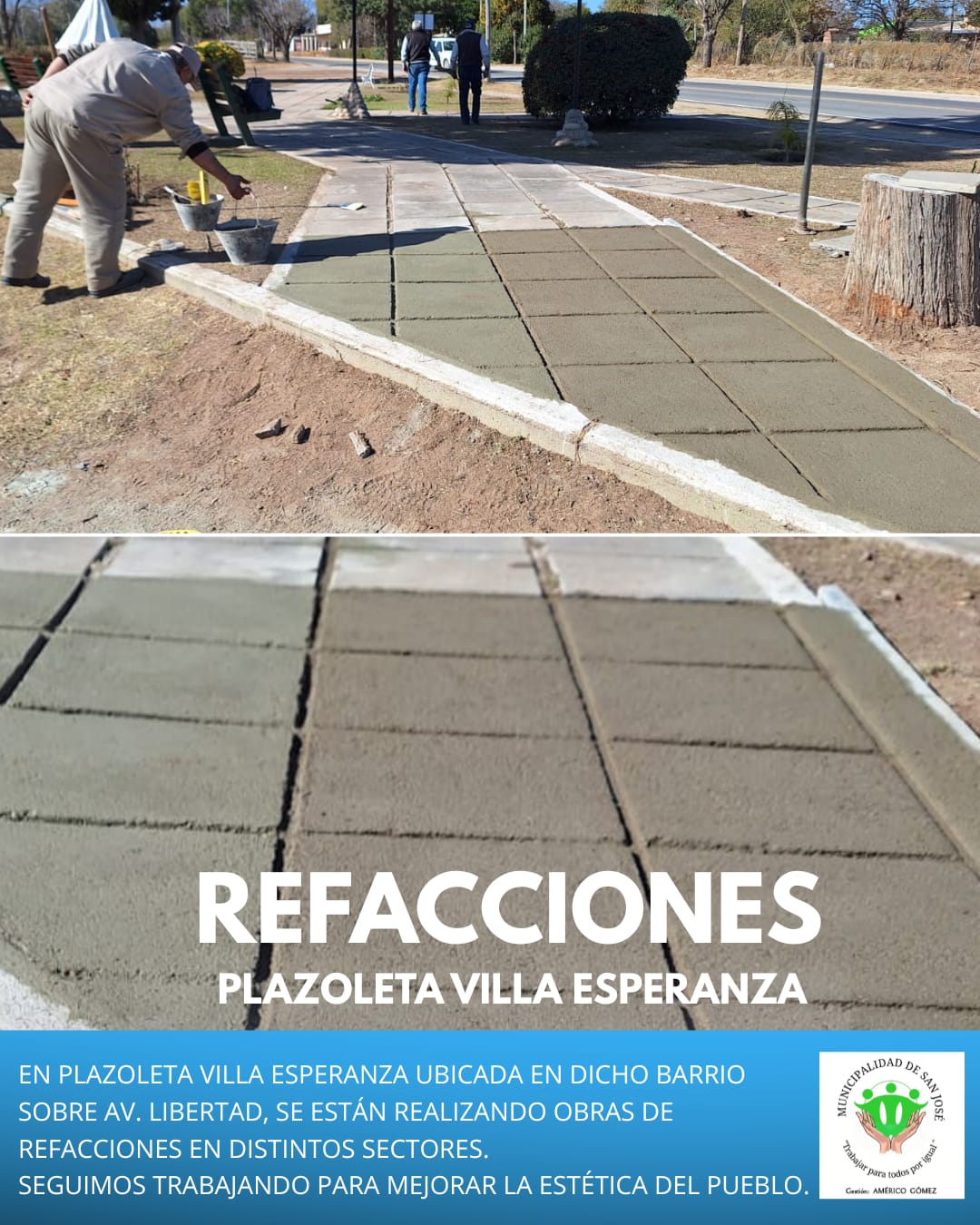 REFACCIONESPlazoleta Villa Esperanza En Plazoleta Villa Esperanza ubicada en dicho barrio sobre Av. Libertad, se están realizando obras de refacciones en distintos sectores.Seguimos trabajando para mejorar la estética de nuestro pueblo. Gestión: Américo Gómez«Trabajar para todos por igual»