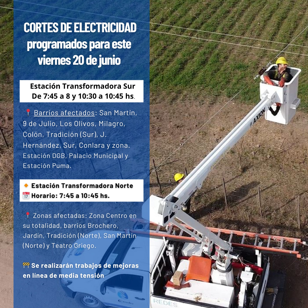🔌 ¡CORTES PROGRAMADOS PARA EL VIERNES! ℹ️ Desde el servicio de energía eléctrica de Cemdo Ltda. informamos que están programados dos cortes para el día viernes 20 de junio de 2025 en los siguientes horarios y zonas: 🔸 Estación Transformadora Sur📅 Horarios: 7:45 a 8:00 hs. y 10:30 a 10:45 hs.📍 Barrios afectados: San Martín, …