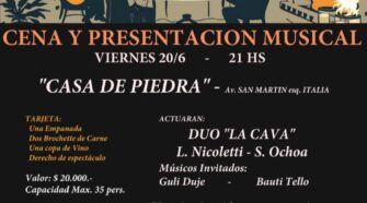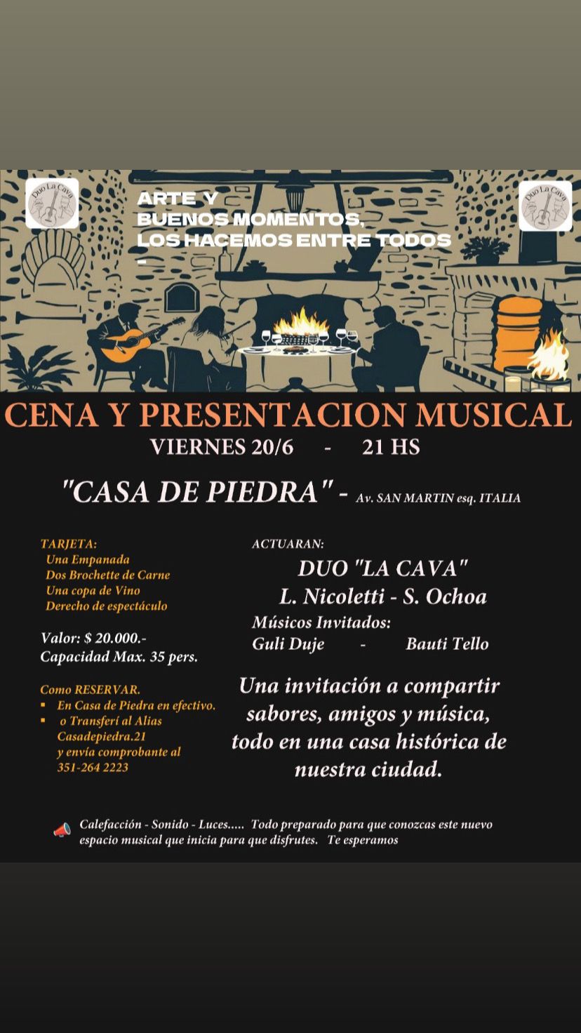 CASA DE PIEDRA PRESENTA ESPECTACULO CENA Y PRESENTACION MUSICAL VIERNES 20/06 A LAS 21 HORAS DUO «LA CAVA» ULTIMOS LUGARES AV SAN MARTIN ESQ/ ITALIA RESERVAS AL 351 – 264 – 2223
