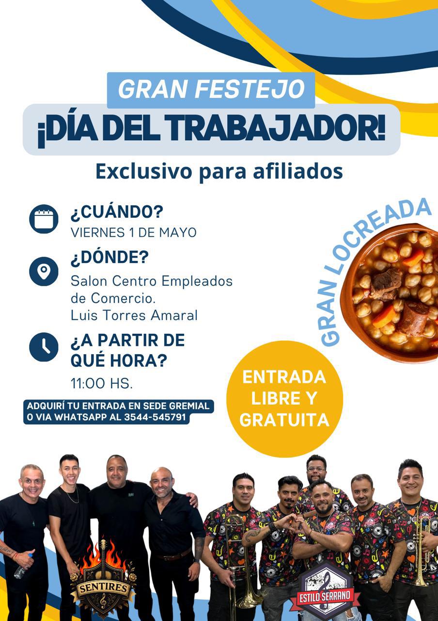 Gran locreada día del trabajador 🙌🏽Viernes 1 de mayo veni a compartir un día en familia en el predio del C.E.C en piedra pintada. Estamos organizando un hermoso evento para que podamos disfrutar nuestro día todos juntos! Con bandas en vivo, un exquisito locro y muchos juegos para los niños. Trae tu conservadora con tu bebida, reposera y ganas de pasar un lindo día. Para solicitar tu cupón para el ingreso comunícate a nuestro whatssap 3544-545791 Entrada libre y gratuita para afiliado y grupo familiar ¡no te quedes sin tu cupón!⚠️Tenes tiempo hasta el 20 de abril para poder solicitarlo ⚠️
