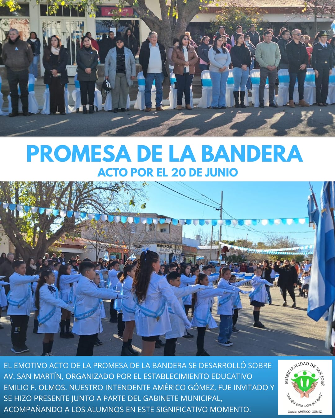 El emotivo acto de la promesa de la Bandera se llevó a cabo en dos significativos escenarios de nuestro pueblo: en la Escuela General San Martín de B° El Barrial y tambien sobre Av. San Martín frente Escuela Emilio F. Olmos. Nuestro Intendente se unió a la celebración junto a parte del gabinete, acompañando a …
