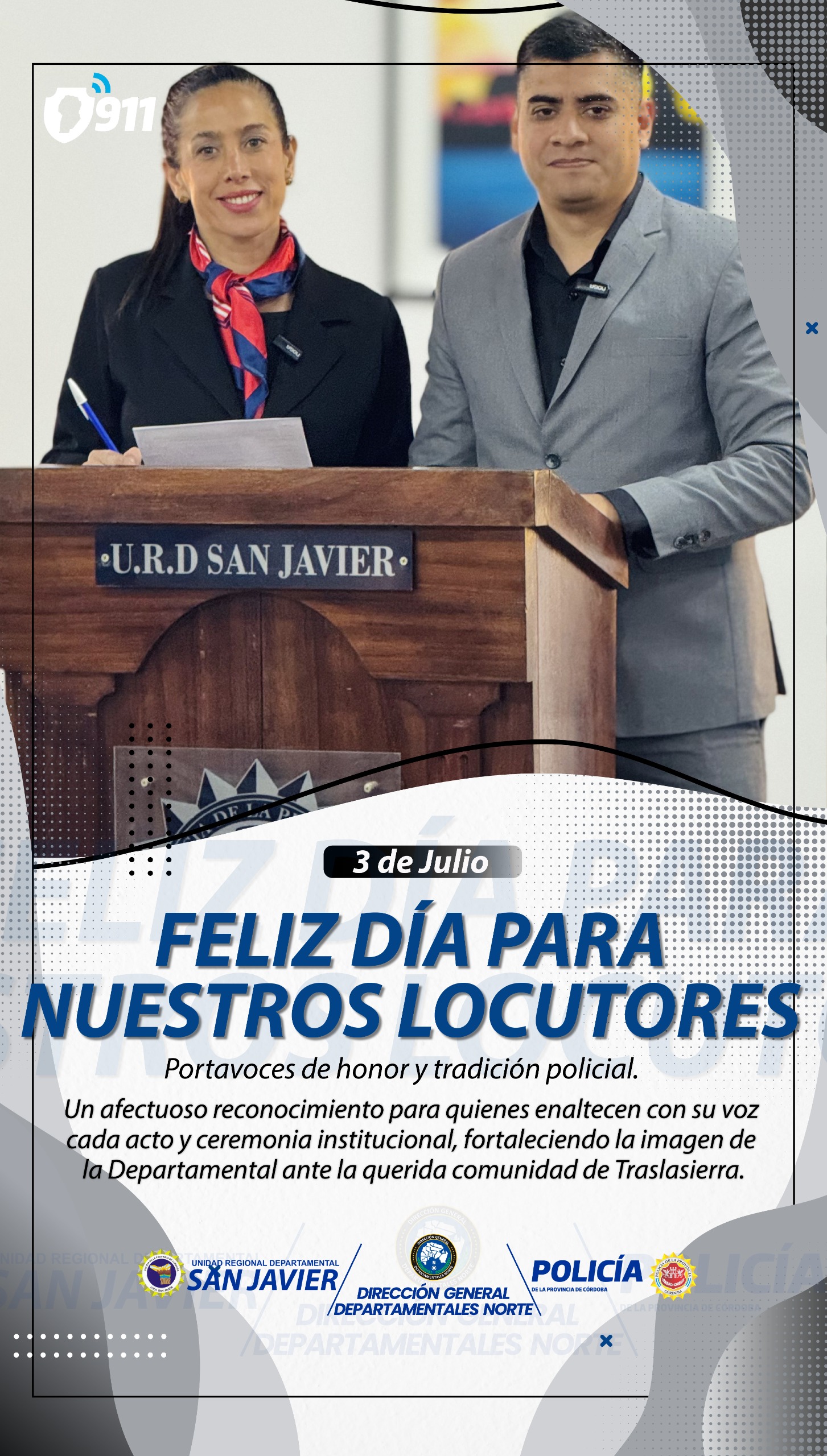 POLICÍA DE LA PCIA. DE CBA.URD SAN JAVIER Miércoles 3 de Julio de 2025 DÍA DEL LOCUTOR: RECONOCIMIENTO A LA VOZ DE NUESTRA INSTITUCIÓN En el marco del Día del Locutor, desde la Unidad Regional Departamental San Javier se brindó un afectuoso reconocimiento a quienes, con profesionalismo y compromiso, representan con su voz el sentir …
