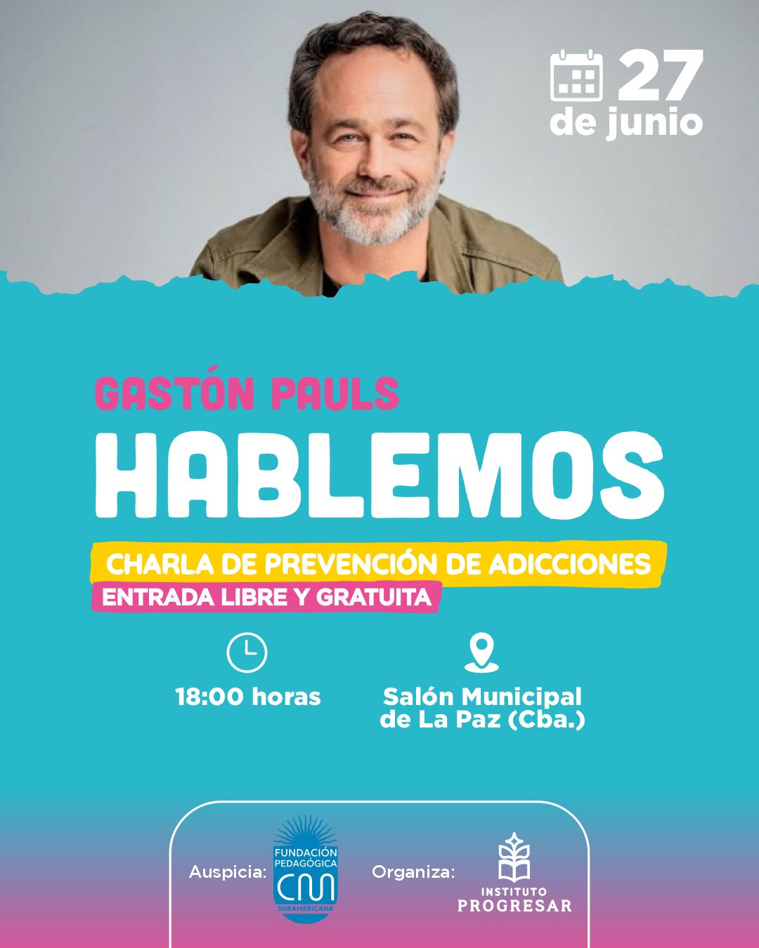 Gastón Pauls en La Paz 🧠✨ La Paz, Traslasierra. El viernes 27 de junio será una fecha para marcar en el calendario. Recibiremos a Gastón Pauls, quien nos brindará una charla sobre prevención de adicciones.El encuentro será a las 18:00 horas en el Salón Municipal, con entrada libre y gratuita. 📢 Organiza el Instituto PROGRESAR …