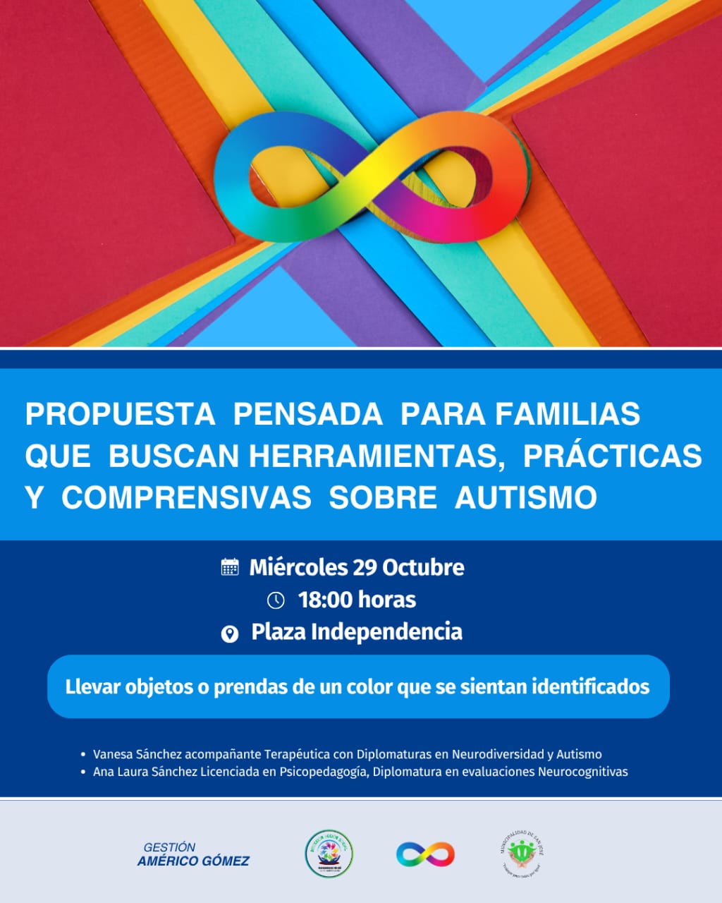 PROPUESTA PENSADA PARA FAMILIAS QUE BUSCAN HERRAMIENTAS, PRÁCTICAS Y COMPRENSIVAS SOBRE AUTISMO 🔹️Miércoles 29 de Octubre🔹️18:00 horas🔹️Plaza Independencia, San José Llevar objetos o prendas de un color que se sientan identificados La charla va a estar a cargo de; Vanesa Sánchez acompañante Terapéutica con Diplomaturas en Neurodiversidad y Autismo. Ana Laura Sánchez Licenciada en Psicopedagogía, …