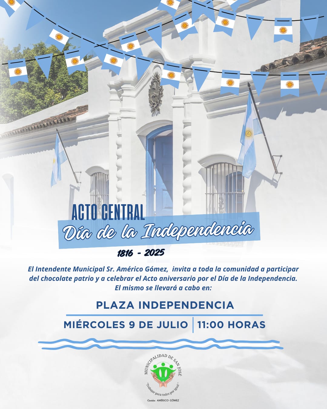 ACTO CENTRALDÍA DE LA INDEPENDENCIA El Intendente Municipal Sr. Américo Gómez, invita a toda la comunidad a participar del chocolate patrio y a celebrar el Acto Aniversario por el Día de la Independencia.El mismo se llevará a cabo en: Plaza Independencia Miércoles 9 de Julio 11:00 horas ¡Los esperamos! Gestión: Américo Gómez«Trabajar para todos por …