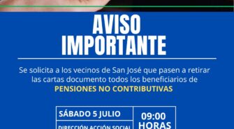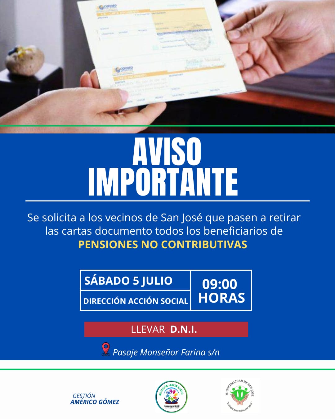 📌AVISO IMPORTANTE Se solicita a los vecinos de San José que pasen a retirar las cartas documento todos los beneficios de PENSIONES NO CONTRIBUTIVAS.En el respectivo día y horario; 🔸️Sábado 5 de Julio🔸️09:00 horas🔸️Dirección de Acción Social(Pasaje Monseñor Farina s/n) 🔸️Llevar D.N.I. Gestión: Américo Gómez«Trabajar para todos por igual»