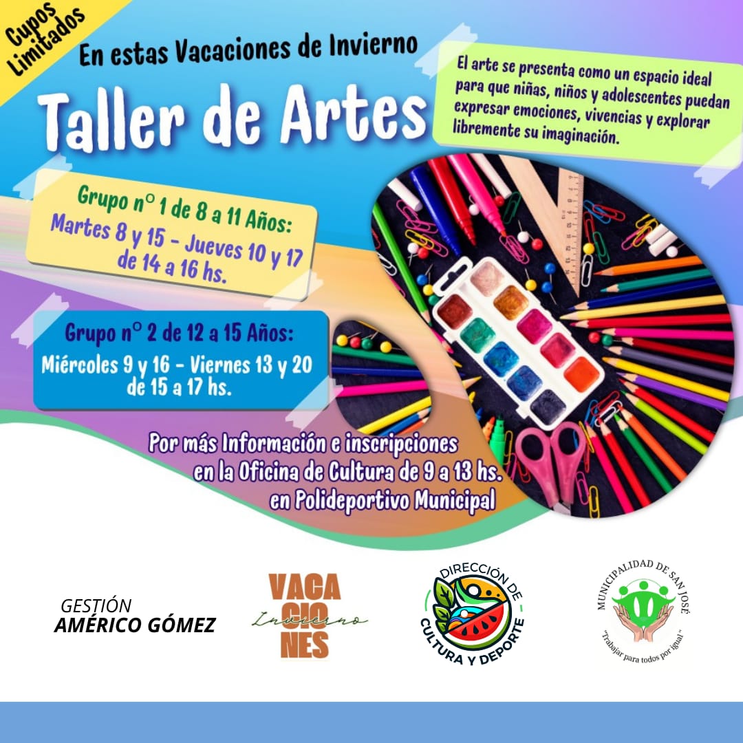 VACACIONES DE INVIERNOTALLER DE ARTES El arte se presenta como un espacio ideal para que niñas/os y adolescentes puedan expresar emociones, vivencias y explorar libremente su imaginación. 🔹️Grupo número uno: De 8 a 11 años de edad Los días Martes 8 y 15 de Julio Los días Jueves 10 y 17 de Julio En el …