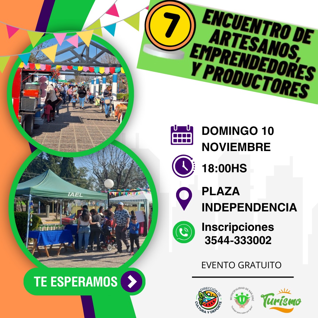 7to ENCUENTRO DE ARTESANOS, EMPRENDEDORES Y PRODUCTORESSan José Domingo 10 de Noviembrea partir de las 18hsplaza central (Plaza Independencia) todos aquellos que deseen colocar sus puestos deben inscribirse al siguiente número telefónico 3544-333002(Evento gratuito)¡Los esperamos! Gestión: Américo Gómez«Trabajar para todos por igual»