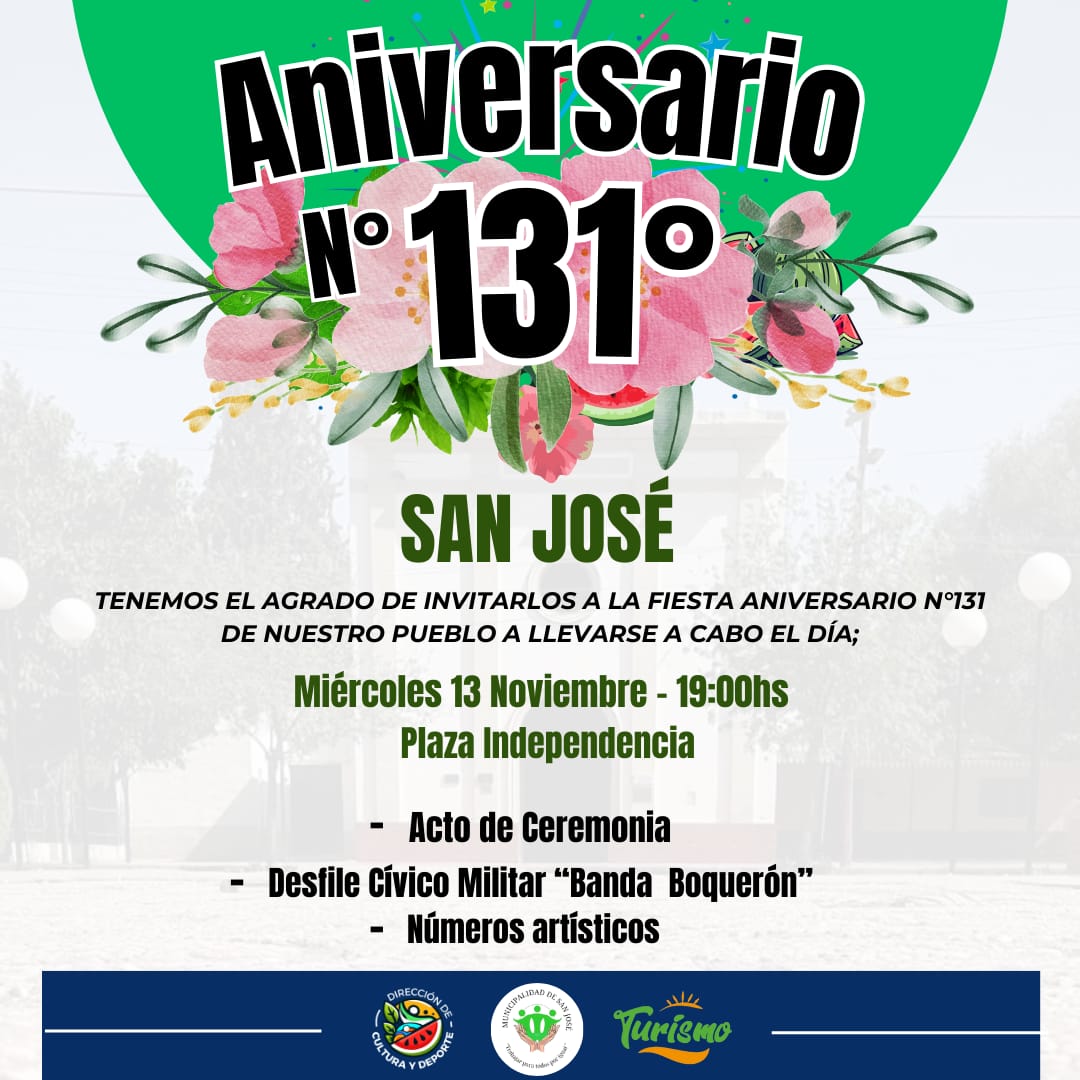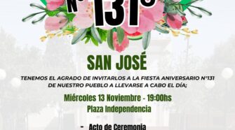 ANIVERSARIO N° 131 Tenemos el agrado de invitarlos a la fiesta aniversario N° 131 de nuestro pueblo a llevarse a cabo el dia; Miércoles 13 Noviembre a las 19hs Plaza Independencia En donde tendremos el acto de ceremonia, desfile Cívico Militar con la presencia de «Banda Boquerón» y distintos establecimientos y además grandes números artísticos …