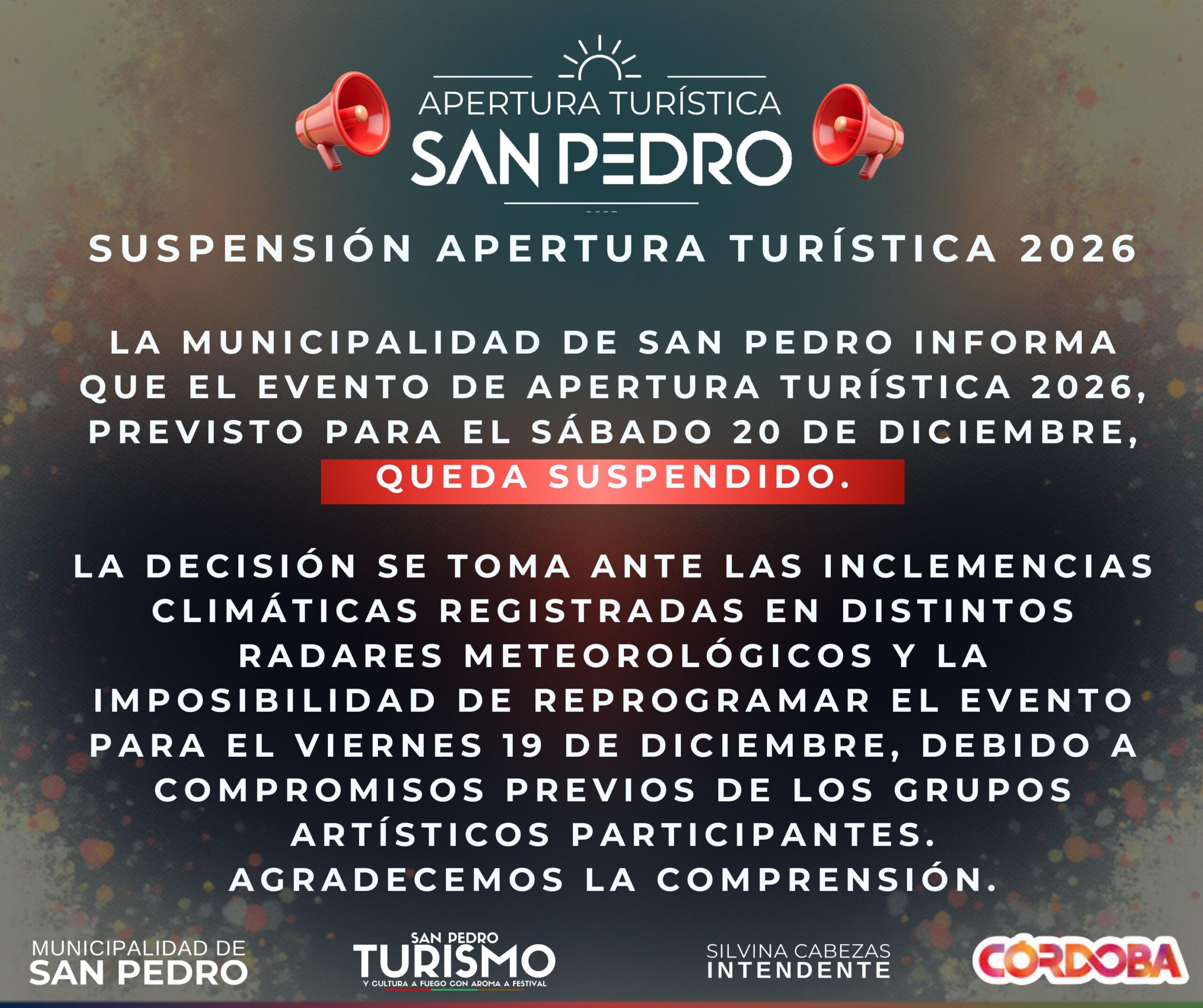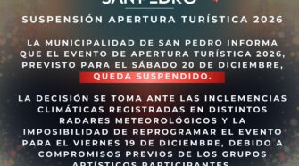 🚨 SUSPENSIÓN APERTURA TURÍSTICA 2026 🚨 La Municipalidad de San Pedro informa que el evento de Apertura Turística 2026, previsto para el 📅 sábado 20 de diciembre, queda suspendido. La decisión se toma ante las 🌧️ inclemencias climáticas registradas en distintos radares meteorológicos y la imposibilidad de reprogramar el evento para el viernes 19 de …