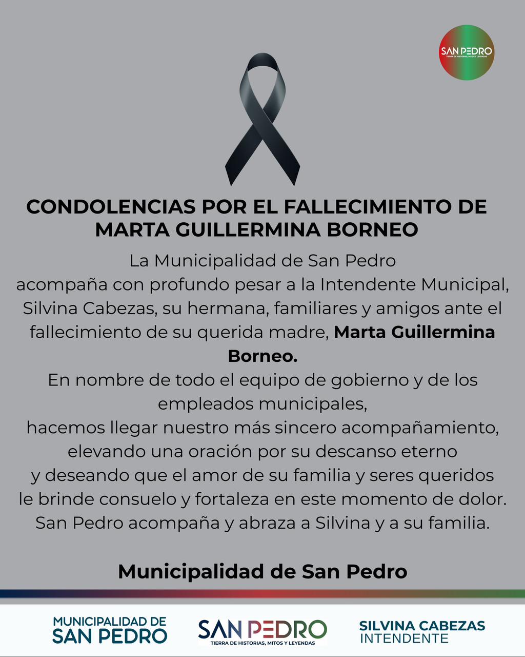 Condolencias por el fallecimiento de Marta Guillermina Borneo. La Municipalidad de San Pedroexpresa su más sentido acompañamiento a la Intendente Municipal, Silvina Cabezas,a su hermana, familiares y amigos,ante el fallecimiento de su querida madre, Marta Guillermina Borneo. En nombre de todo el equipo de gobierno y de los empleados municipales, hacemos llegar nuestro más sincero …