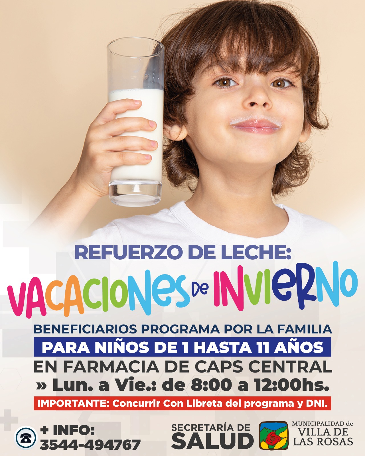 🥛 REFUERZO DE LECHE: VACACIONES DE INVIERNO ❄️ 👉 Ya comenzó la entrega del refuerzo de leche para niños y niñas de 1 a 11 años que forman parte del Plan por la Familia. 🏥 La misma se realiza en la farmacia del CAPS Central de Villa de Las Rosas, de lunes a viernes, de …