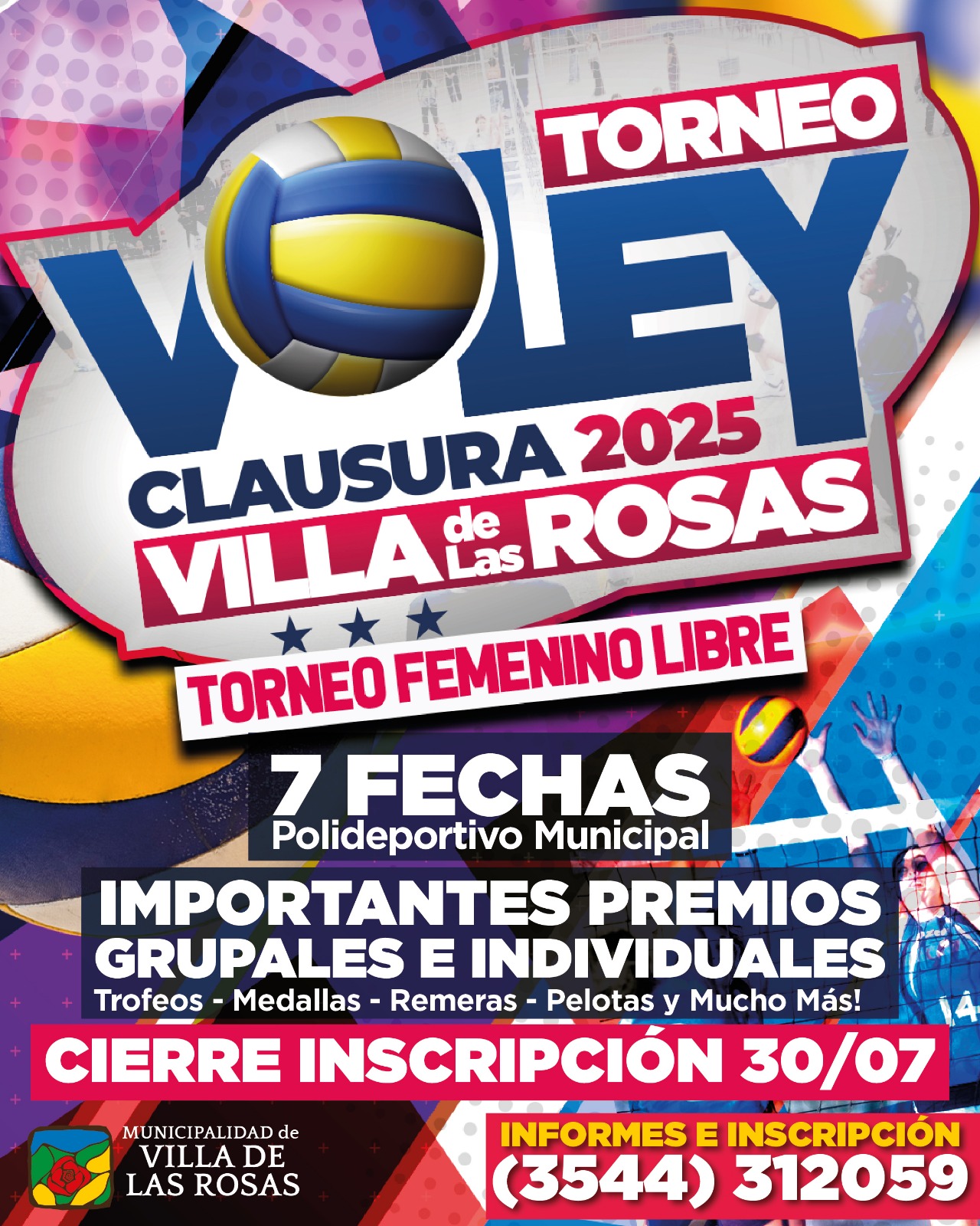 ✨ ¡ÚLTIMOS DÍAS PARA INSCRIBIR TU EQUIPO! 🌹🌹 🏐 Hasta el miércoles 30 de julio podes anotarte en el Torneo Clausura 2025 de Vóley Femenino Villa de Las Rosas. 💥 Serán 7 emocionantes fechas en el Polideportivo Municipal, con grandes premios grupales e individuales: trofeos, medallas, remeras, pelotas ¡y mucho más! 📲 Más info e …